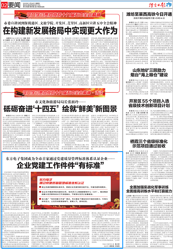 东莞市明致精密制造有限公司党建实现标准化,给全市国有企业提供了典范。市国资委党委副书记、副主任王洪祥表示,东莞市明致精密制造有限公司作为烟台市首个将党建工作纳入ISO9001党建标准质量管理体系进行系统化、标准化建设的先行实践企业,将为我市国有企业新时期党的建设创新提供鲜活的思路与经验,为市管企业今后在党建工作系统化、规范化、科学化建设做出了有益探索和创新。“这种模式完全可以尝试在全市国有企业进行复制、推广,以高质量党建引领国有企业实现高质量发展。”王洪祥如是说。